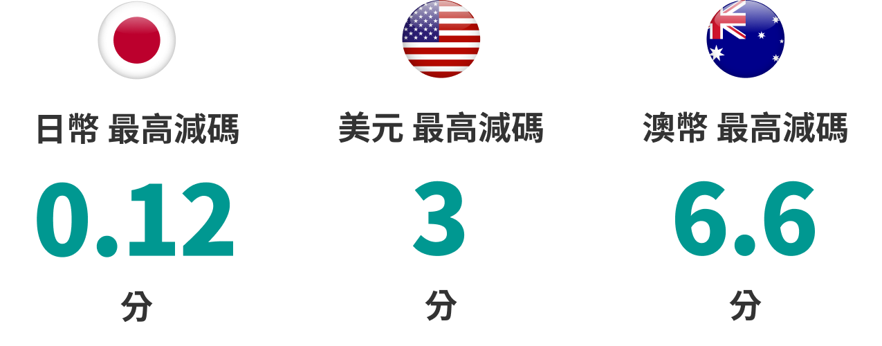 *每日享一次免費酷碰券兌換次數,可選擇兌換換匯優惠券 - 優惠內容:新臺幣單筆兌換14種指定幣別享即期匯差優惠,最佳可享有的匯差優惠如下表